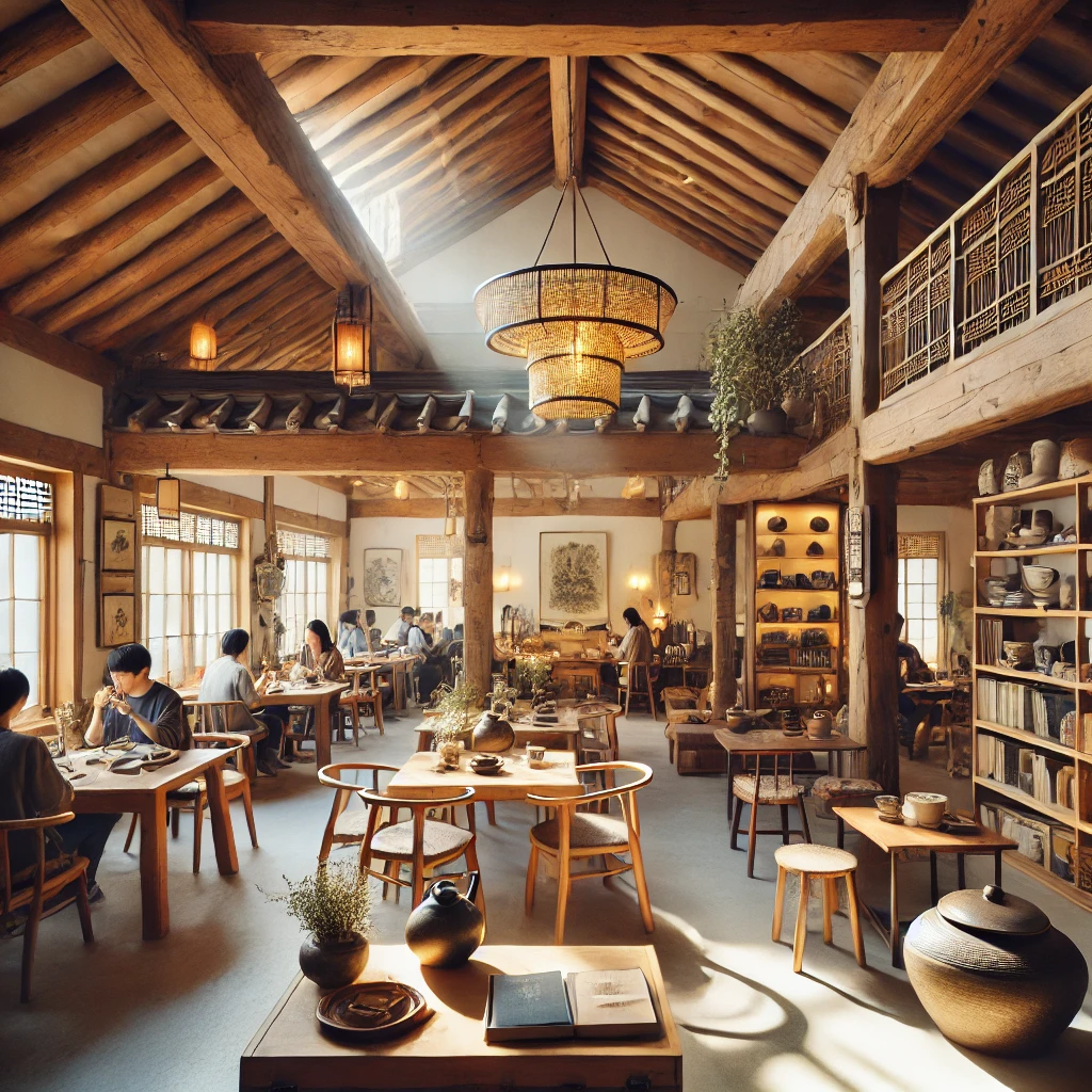 따뜻한 한옥 목재 인테리어에 햇살이 들어오고, 전통적인 디테일과 모던 감성이 조화롭게 어우러짐