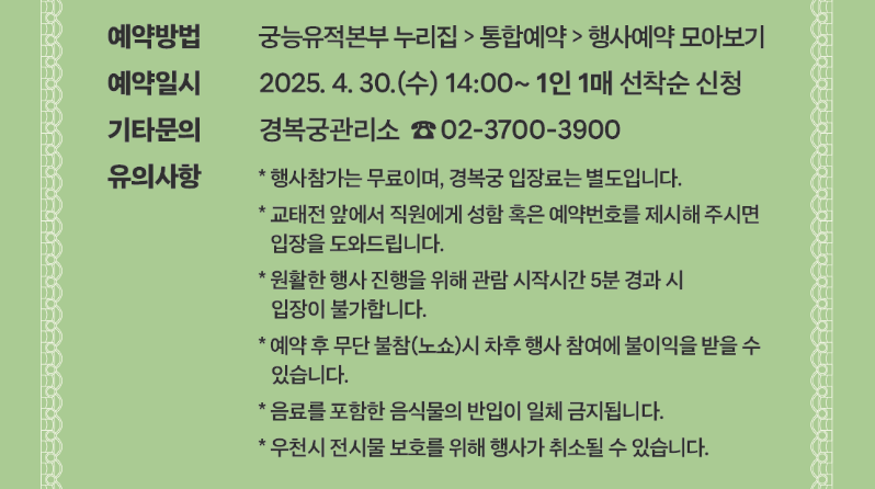 • 예매처: 궁능유적본부 누리집, 통합예약시스템