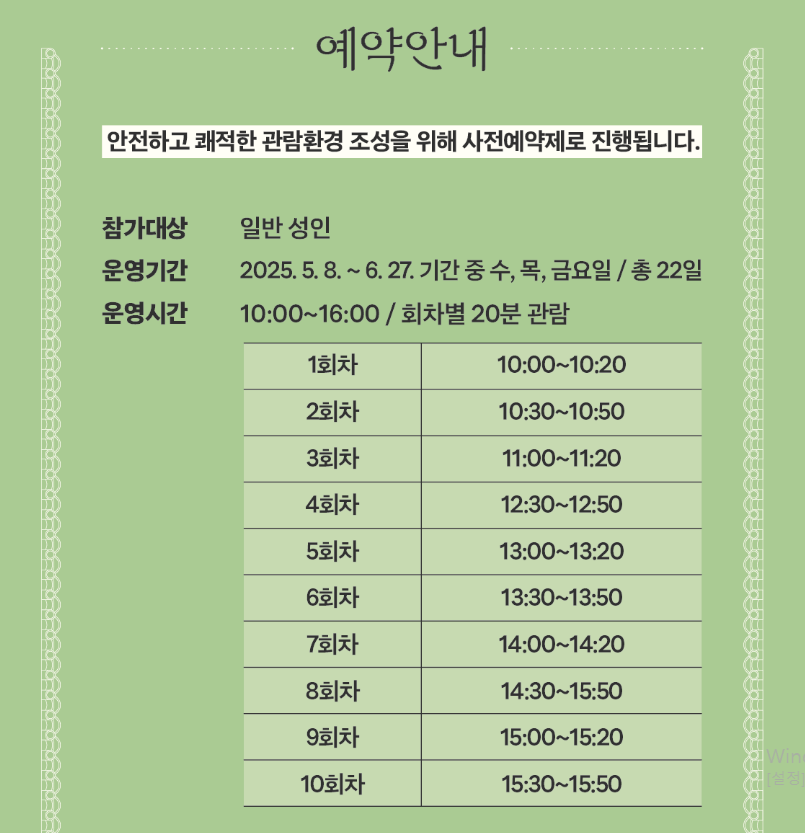 • 시작일: 2025.04.30 오후 2시부터 -- 기간 2025.05.08 ~ 06.27 (수·목·금 운영)