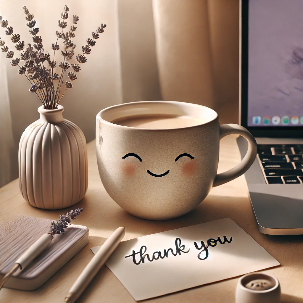 닫힌 노트북, 웃는 얼굴의 머그컵, 그리고 작은 감사 카드가 어우러진 평온한 분위기