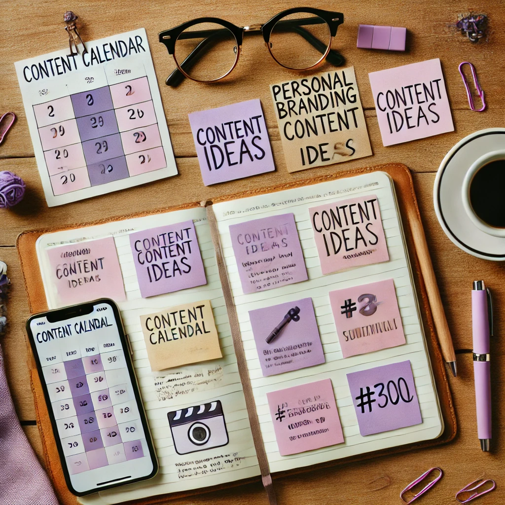 퍼스널 브랜딩 콘텐츠를 기획하는 정돈된 책상 위의 요소들을 따뜻하고 창의적인 느낌
