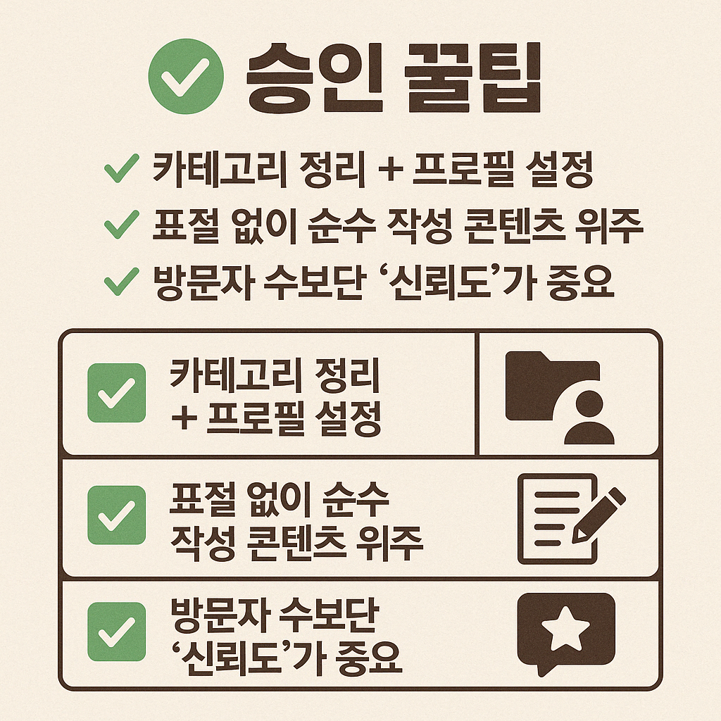 💡 최근에는 AI로 자동 심사되기 때문에 초기 블로그도 정갈하게 운영하면 승인 확률 높아져요!