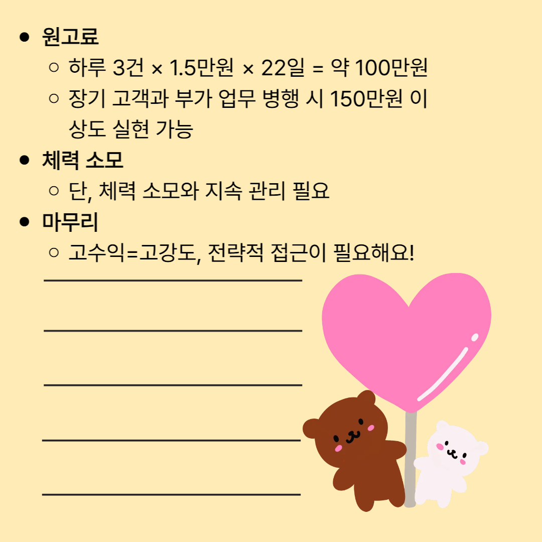 👉 하루 3건 × 1.5만원 × 22일 = 99만 원