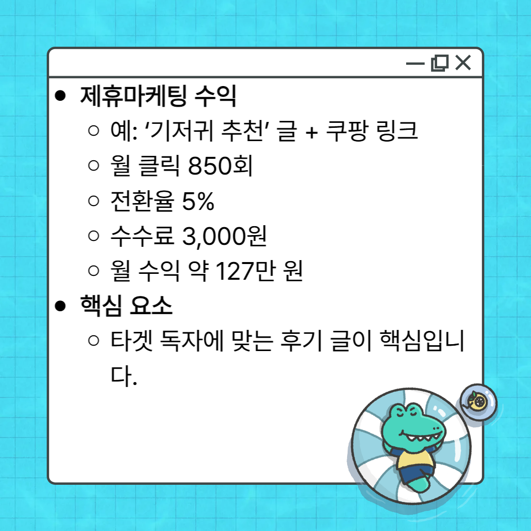 - 제휴마케팅: 진입 장벽 낮고 빠른 수익 가능