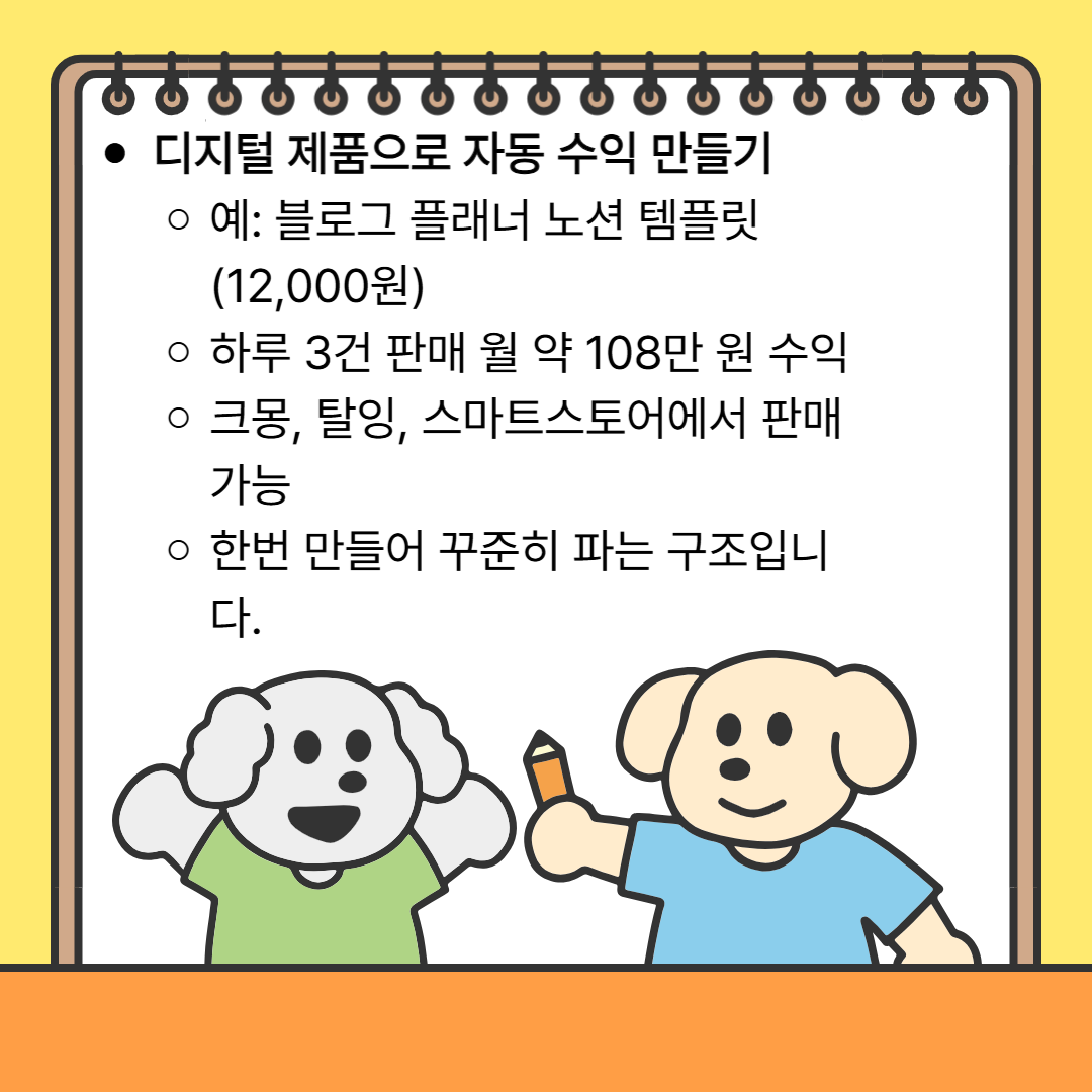 | 디지털 제품 판매 | 템플릿, 툴, 노션, 에셋 판매 | 재고 없음, 자동화 가능 | 마케팅 필요 |