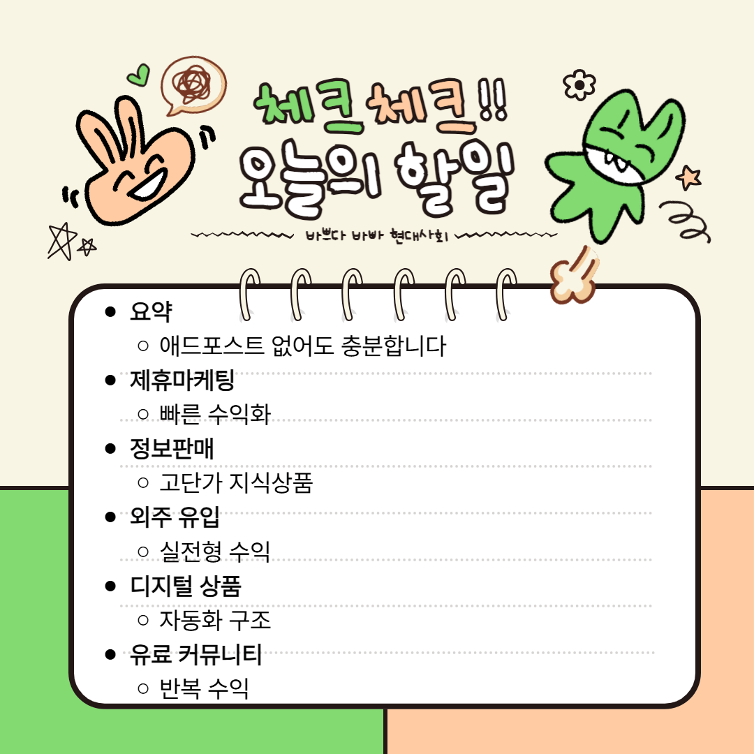 | 커뮤니티 유료화 | 네이버 카페, 뉴스레터 등 유료화 | 구독 기반 반복 수익 | 신뢰와 콘텐츠가 핵심 |