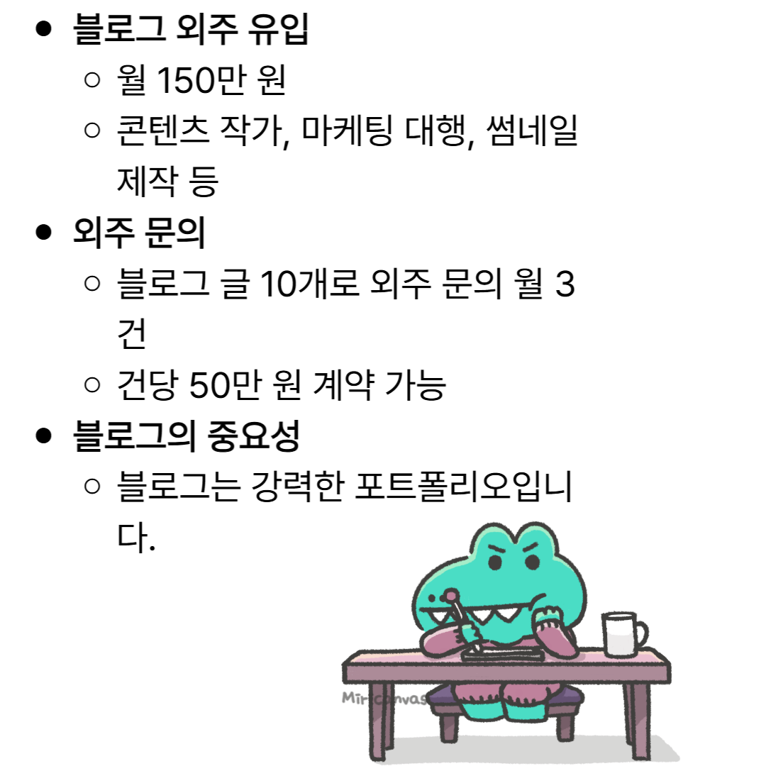| 외주 유입 | 블로그 포트폴리오로 클라이언트 유입 | 안정적 계약 가능 | 꾸준한 운영 필요 |