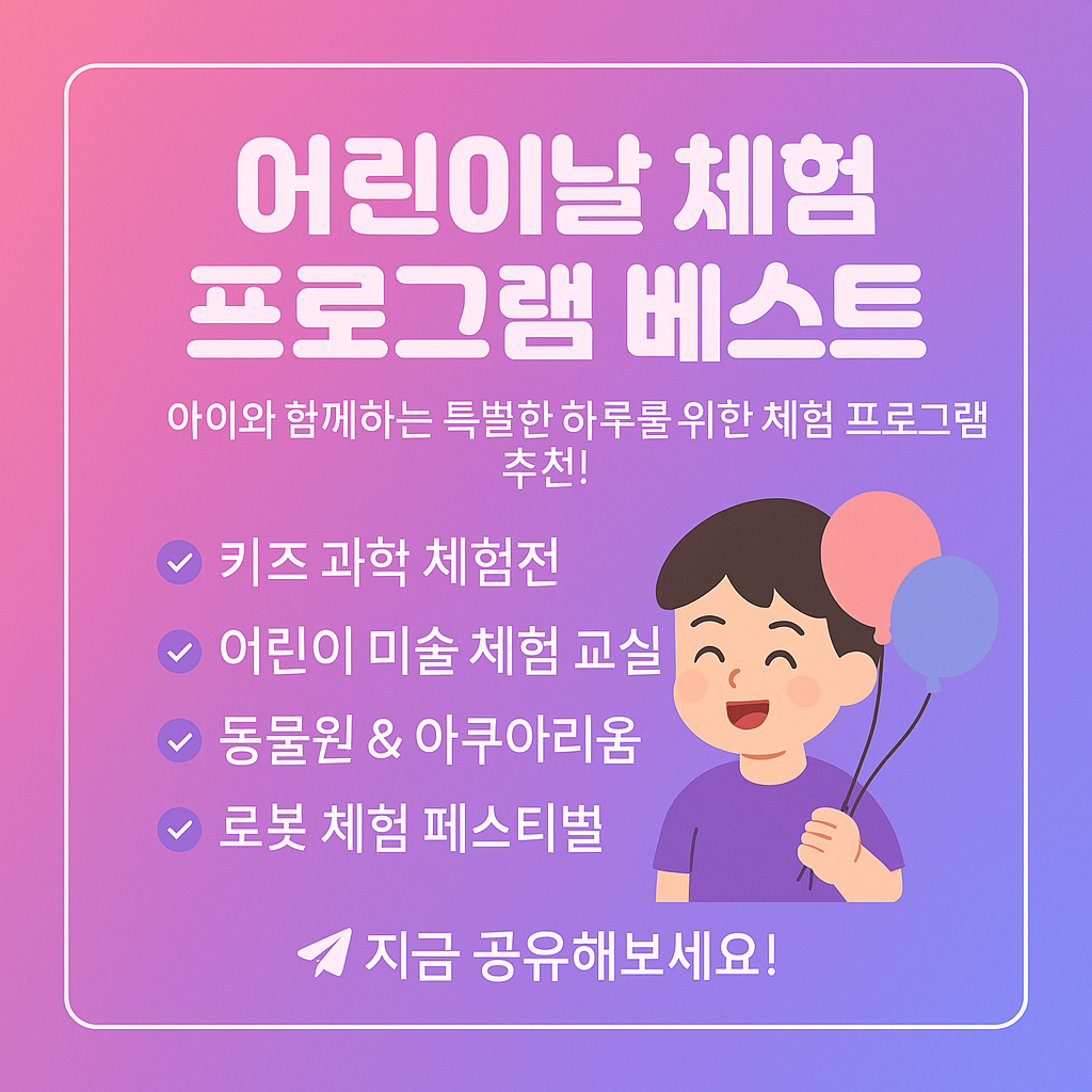 놀이공원, 과학 체험, 문화 예술 프로그램까지! 단순한 선물 대신 생생한 체험을 통해 잊지 못할 추억을 만들어보세요. 오늘은 어린이날을 맞아 추천하는 최고의 체험 프로그램을 소개합니다.