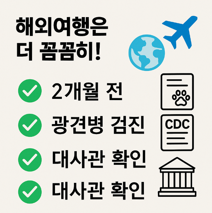 해외여행은 국내보다 훨씬 복잡합니다. 출국 2개월 전부터 해당 국가의 방역 기준, 검역 절차를 확인하고 광견병 예방접종 및 항체가 검사 성적서를 발급받아야 해요. 미국 등 일부 국가는 CDC 허가 서류도 제출해야 입국이 가능합니다. 국가마다 규정이 다르므로 대사관 또는 검역본부를 통해 최신 정보를 확인하세요.