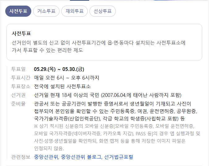 직장이나 일정으로 본 투표가 어려운 분들은 사전투표일(5.29~30)에 미리 참여하세요.