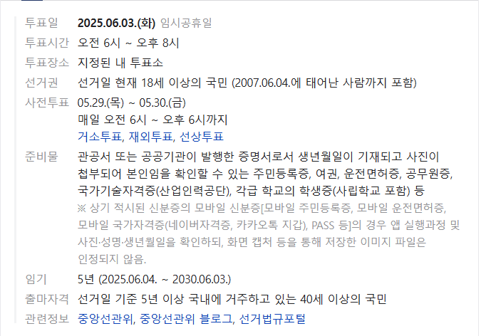 유권자는 선거일 기준 만 18세 이상인 대한민국 국민으로, 2007년 6월 4일 이전 출생자라면 투표권이 주어집니다. 사전투표는 5월 29일(목)과 5월 30일(금) 양일간 오전 6시부터 오후 6시까지 전국 어디서나 가능합니다.