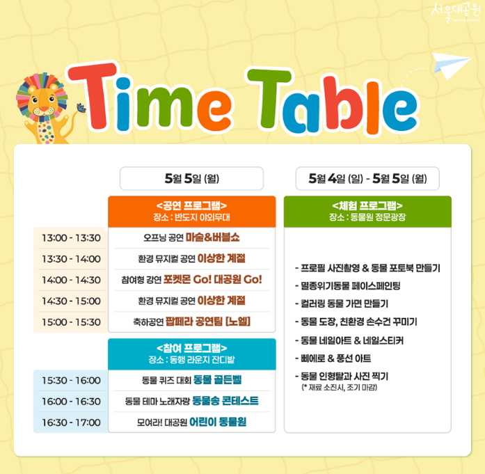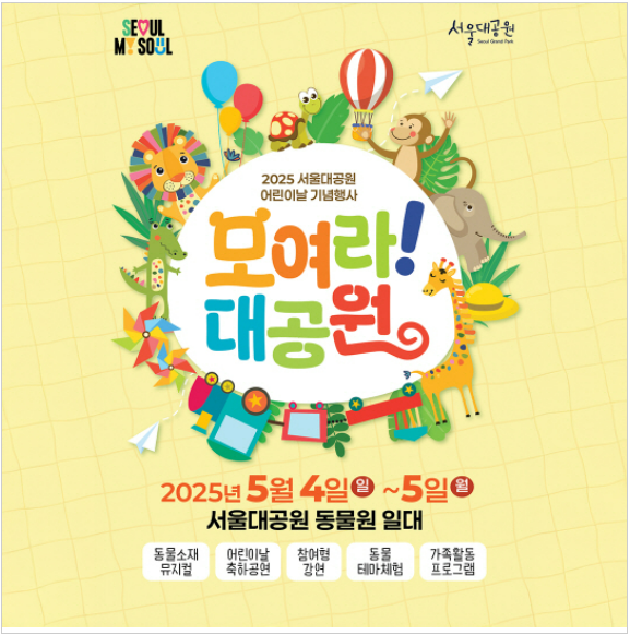 | 서울대공원 '모여라! 대공원' | 5월 4일(일) ~ 5일(월) | 서울대공원 동물원 일대 | 전 연령 | 서울대공원 공지 |