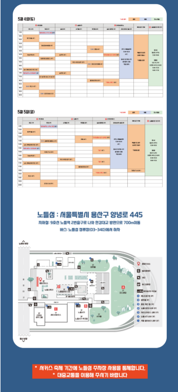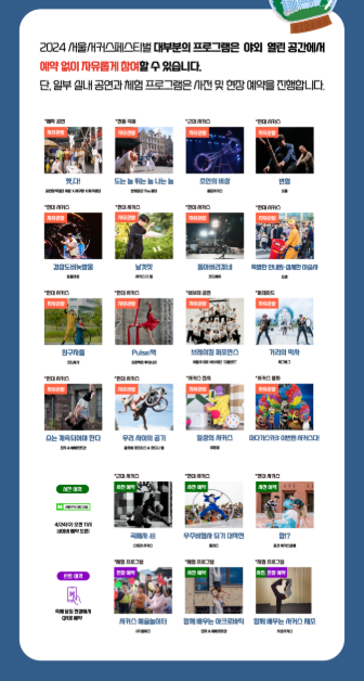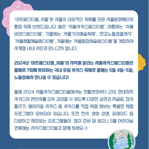 | 서울서커스페스티벌 | 5월 3일(토) ~ 5일(월) | 노들섬 | 전 연령 | 서울문화재단 공지 |