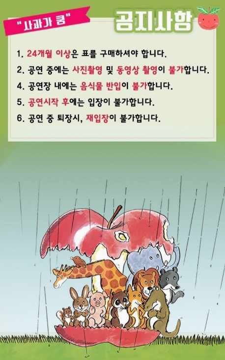 숲 속 동물 친구들이 떨어진 사과를 둘러싸고 벌이는 소동을 통해 '협동심과 소통의 중요성'을 유쾌하게 그려낸 작품입니다. 유아부터 저학년까지 쉽게 이해할 수 있는 구성입니다. - 서울대공원 '모여라! 대공원'