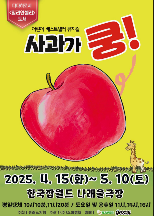 | 어린이 뮤지컬 '사과가쿵' | 4월 19일(토) ~ 5월 10일(토) | 한국잡월드 나래울극장(성남) | 24개월 이상 | 예스24 티켓 |