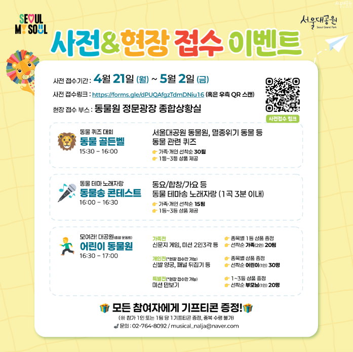 | 서울대공원 '모여라! 대공원' | 5월 4일(일) ~ 5일(월) | 서울대공원 동물원 일대 | 전 연령 | 서울대공원 공지 |