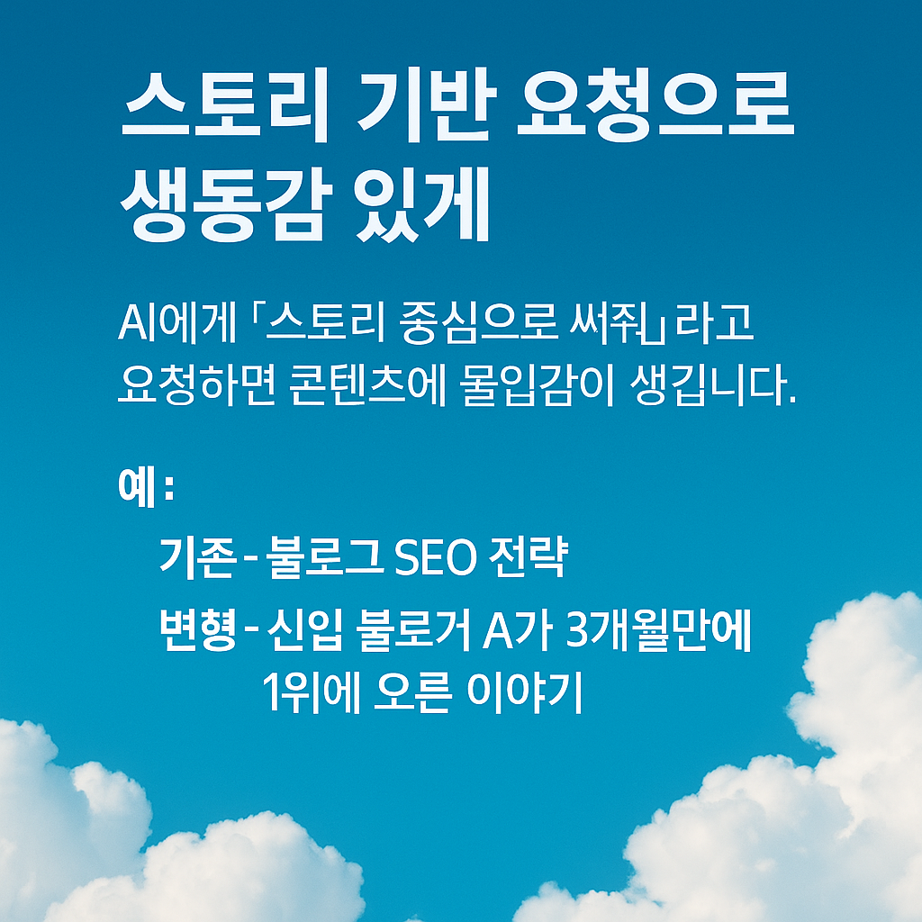 AI에게 “스토리 중심으로 써줘”라고 요청하면 콘텐츠에 몰입감이 생깁니다.