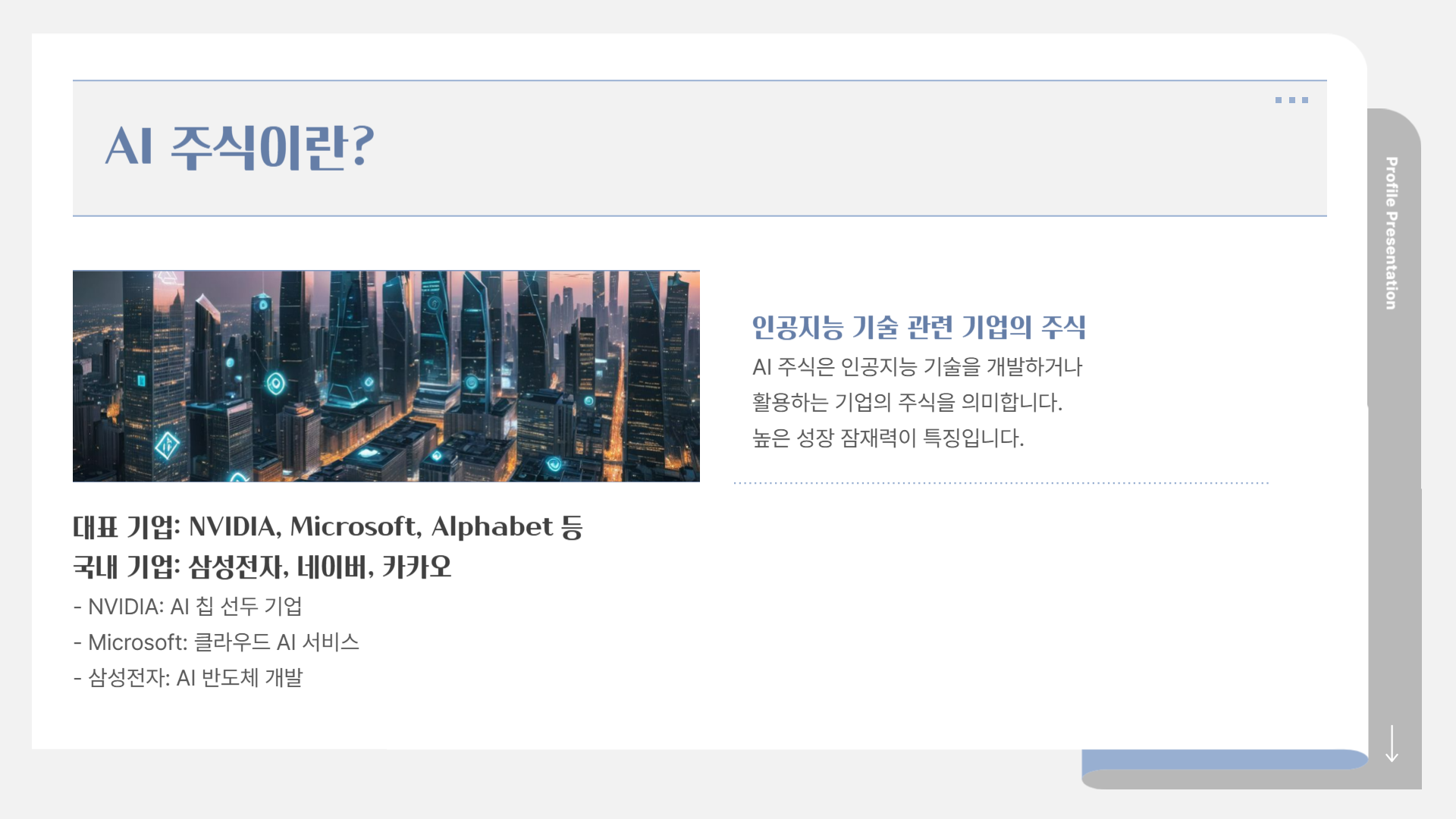 AI 주식은 인공지능 기술과 관련된 제품이나 서비스를 개발하거나 활용하는 기업의 주식을 말합니다. 대표적으로 NVIDIA, Microsoft, Alphabet(구글), AMD, Palantir 등이 이에 해당돼요. 국내에서는 삼성전자, 네이버, 카카오 등이 AI 투자 기업으로 거론되고 있죠.
