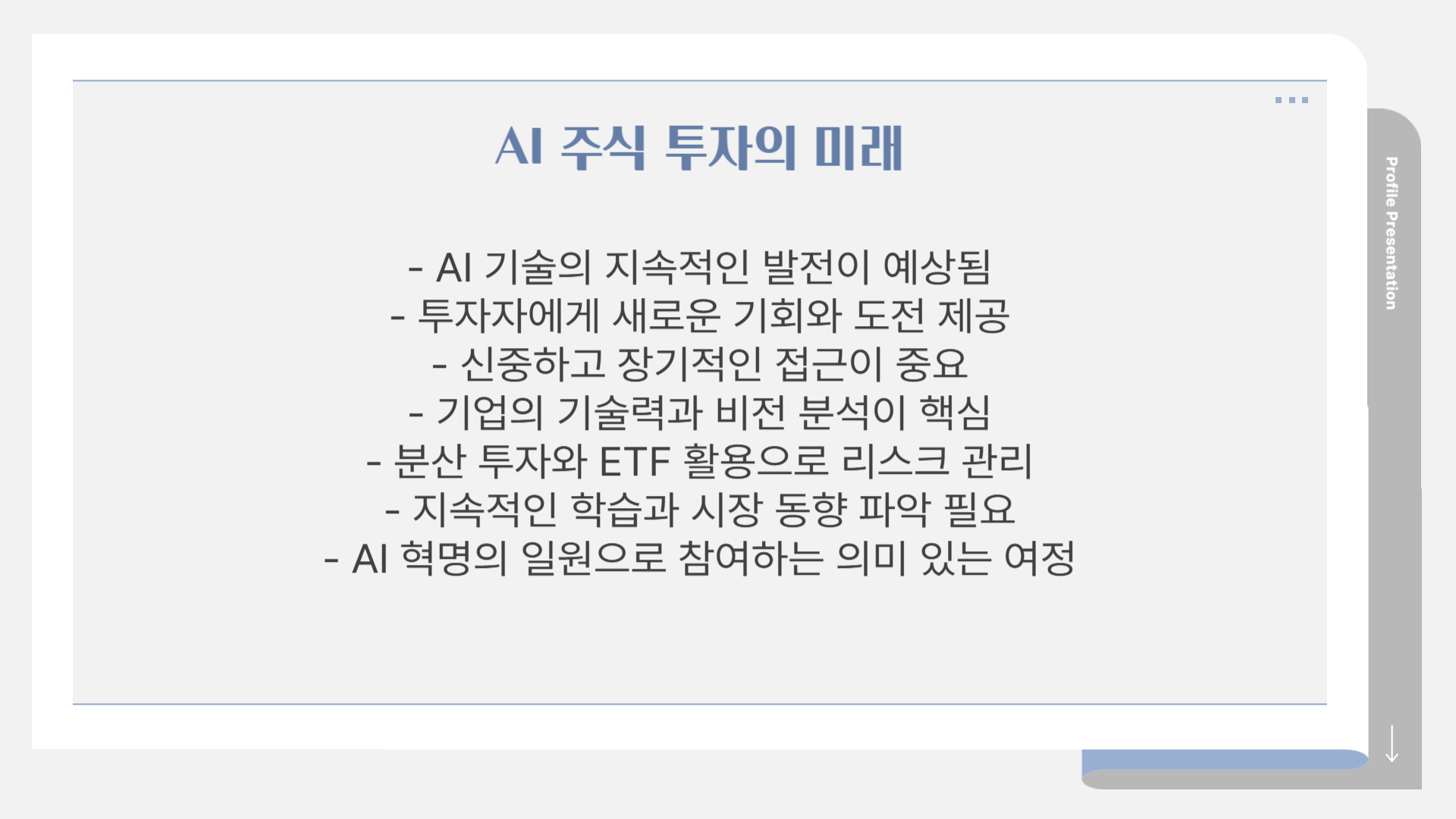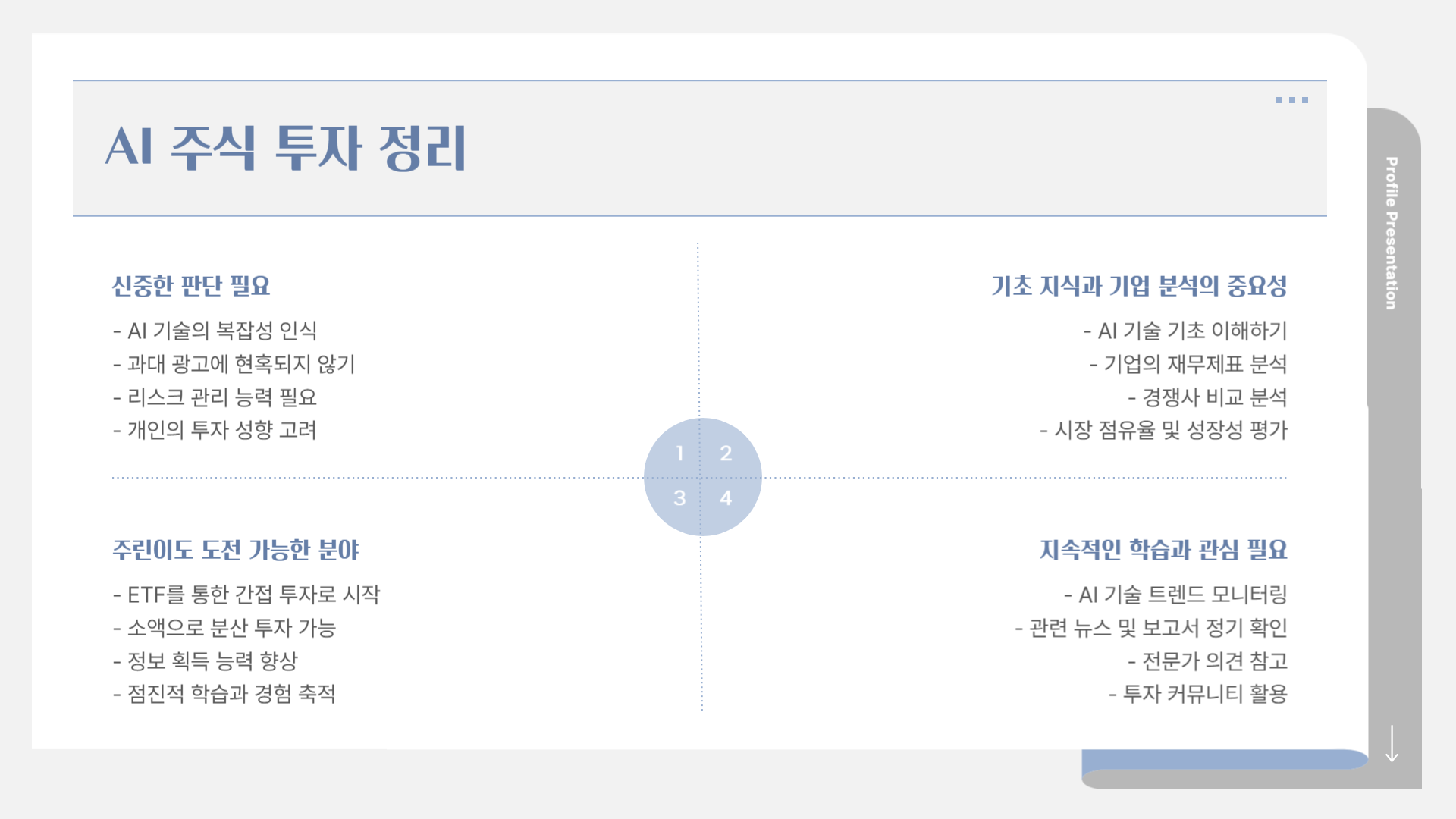 AI 주식은 지금 가장 뜨거운 테마 중 하나지만, 그만큼 신중한 판단이 필요합니다. 기초 지식과 기업 분석만 제대로 하면, 주린이도 충분히 도전할 수 있는 분야예요. 너무 겁먹지 마세요, 시작이 반입니다!