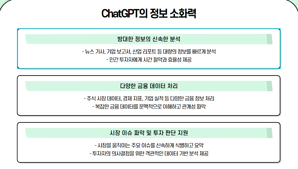 ChatGPT는 뉴스 기사, 기업 보고서, 산업 리포트 등 방대한 정보를 순식간에 분석할 수 있습니다. 이는 인간 투자자에게 큰 이점을 제공하죠. 시장을 움직이는 주요 이슈를 빠르게 파악하고, 그에 따른 투자 판단을 내릴 수 있도록 도와줍니다.