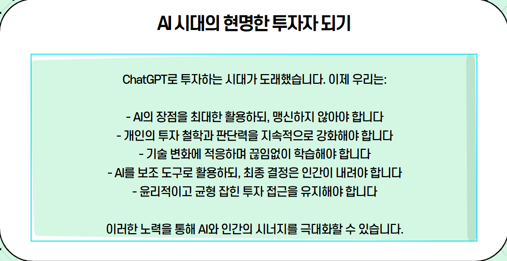 AI가 아무리 똑똑해져도, 결국 투자의 최종 결정은 사람의 몫입니다. 우리는 ChatGPT의 분석을 참고하되, 자신의 투자 철학과 원칙을 세워야 합니다. 또한 AI가 가진 한계와 편향성에 대해서도 충분히 인지하고 있어야 하죠.