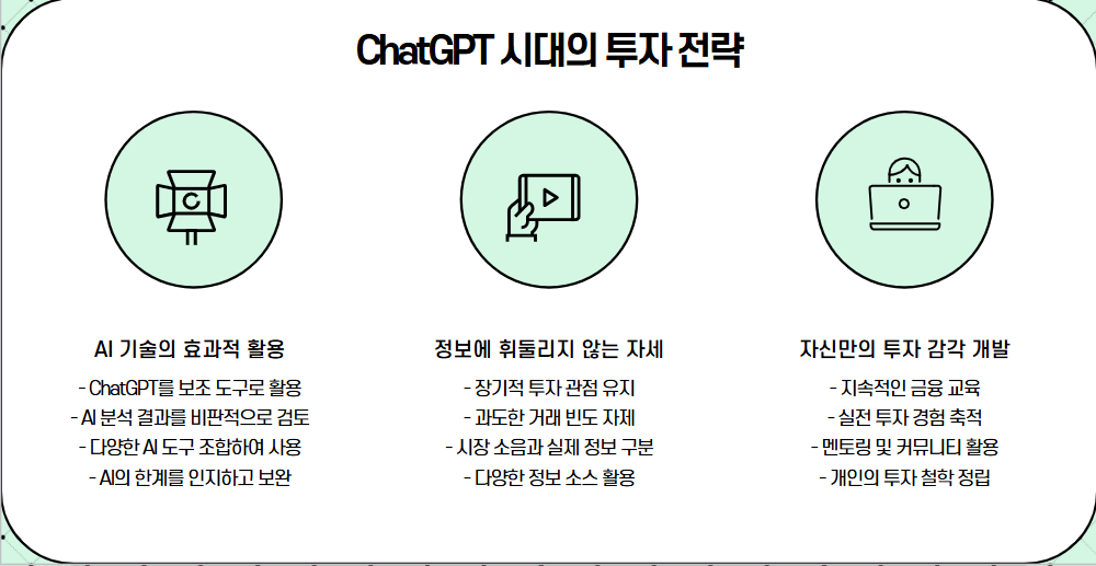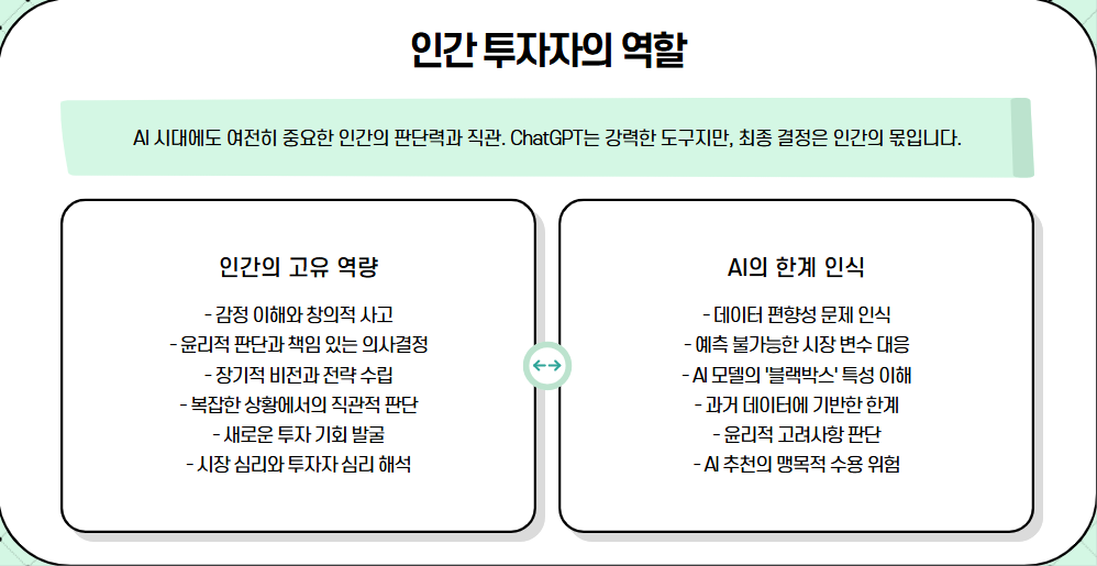 AI가 아무리 똑똑해져도, 결국 투자의 최종 결정은 사람의 몫입니다. 우리는 ChatGPT의 분석을 참고하되, 자신의 투자 철학과 원칙을 세워야 합니다. 또한 AI가 가진 한계와 편향성에 대해서도 충분히 인지하고 있어야 하죠.